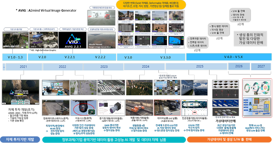 당사는 창업초기부터 Vision기반의 인공지능 성능을 증대하기 위하여 실외 악조건의 실 데이터 확보에 많은 노력과 제한 사항을 극복하기 위하여 AVIG(A2Mind Virtual Image Generator)라는 툴을 개발하여 최근에는 상품화를 하고 있습니다.