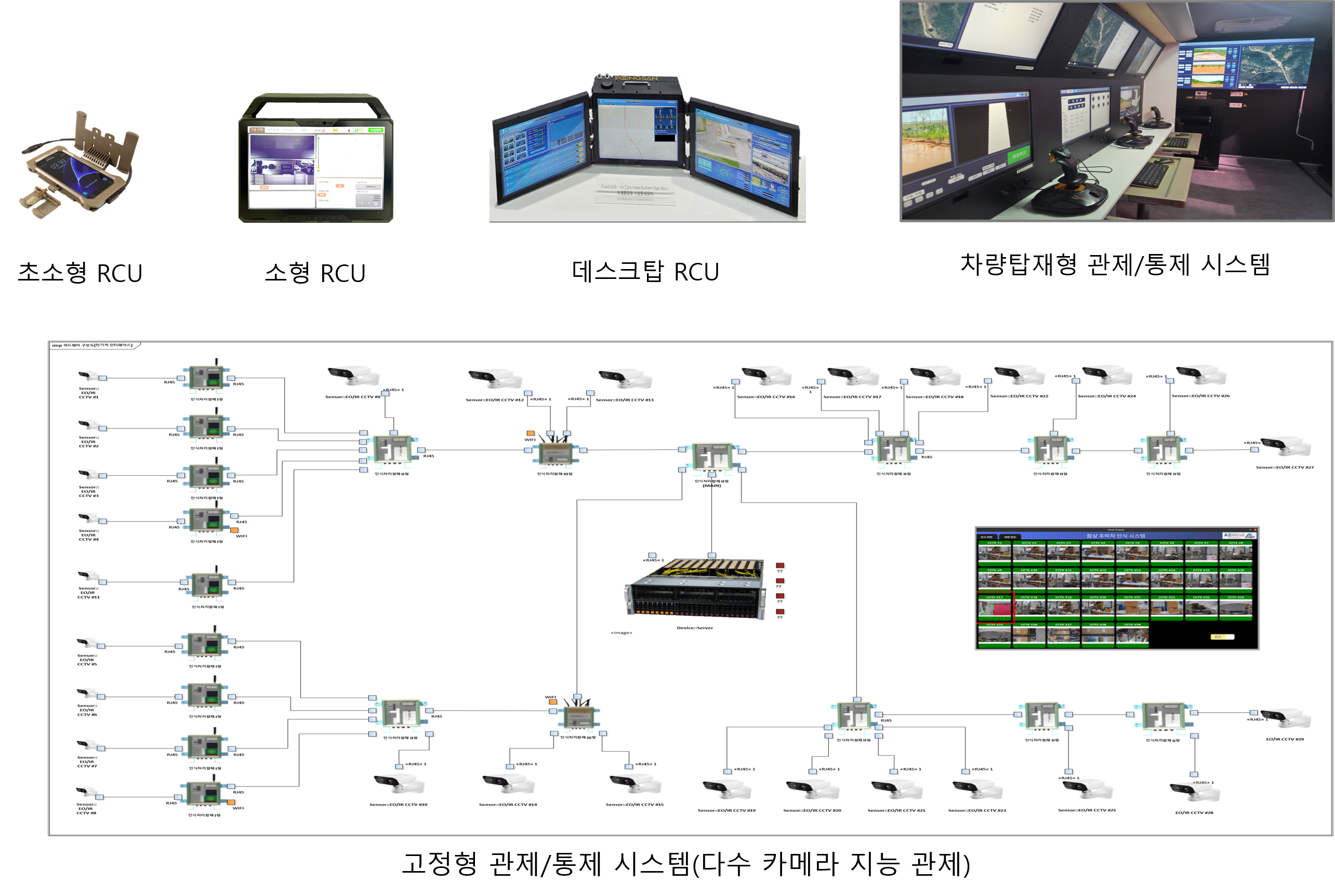 하드웨어는 첫째, 다양한 소형/초소형 이동형 RCU(Robot Control Unit)를 확보하고 있습니다. 본 RCU는 군집 드론 혹은 로봇의 관제/통제에 활용됩니다. 둘째, Desktop형 관제/통제장치입니다. 본 장치는 이동이 가능하지만 정지상태에서 데스크나 관제 사무실 및 필드에서 설치하여 사용하는 개념입니다. 셋째는 차량탑재형 관제/통제 장치입니다. 본 장치는 군집 혹은 다수 드론 및 로봇의 관제/통제를 위하여 지휘관과 운용자가 탑승하는 개념이고 동시에 관제/통제차량의 조종을 담당하는 담당자가 포함됩니다. 따라서 보통 3-4명의 인원(조종수, 지휘관, 운용자 1-2명)이 필요하며 필요시 정지간 조종수와 지휘관이 특정상황에서는 임무를 대신하는 기능이 포함됩니다. 넷째는 다수의 AI 카메라 등을 관제/통제하는 사무실 혹은 건물 배치형 관제/통제장치입니다. 본 장치는 보통 Rack에 컴퓨터나 관련장비를 장착하여 다수의 운용자가 접근 가능한 솔루션입니다. 그러나 모든 지능형 카메라의 인공지능을 기반으로 최소한의 인원이 운용되는 통합 모니터링 환경도 동시에 구현됩니다.당사는 상기 4개 분야의 어떤 특정 응용에 적용가능한 하드웨어 솔루션도 제공하고 있습니다. 소프트웨어는 기본적으로 군집드론 및 로봇분야의 솔루션을 포함하는 것으로 어떤 운용자 혹은 지휘관의 위치에 무관하게 통합상황인식, 임무계획, 경로계획, 비상시 수동백업 등의 기능을 지원하는 소프트웨어가 핵심으로 전체 솔루션 형태로 지원가능한 솔루션입니다.